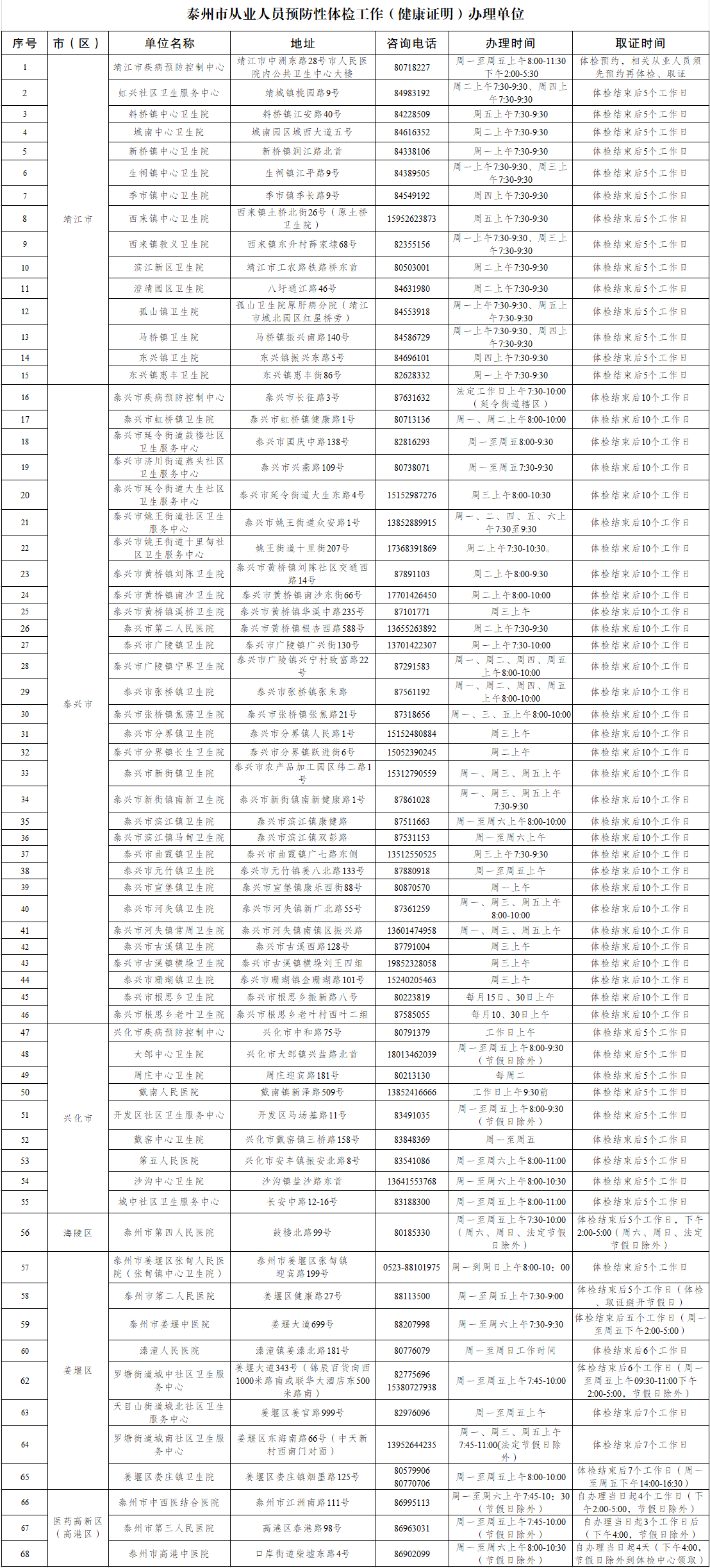 泰州市从业人员预防性体检工作(健康证明)办理单位